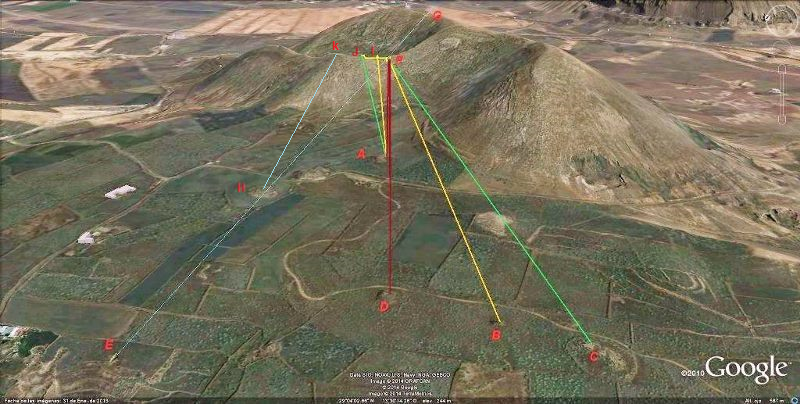 DESDE LA ESPIRAL “H”, CON LA SIMA “K”, EL EQUINOCCIO, ADEMÁS DE LA TAMBIÉN CONSABIDA ALINEACIÓN EQUINOCCIAL ENTRE LA CUEVA “E” Y LAS DOS PUERTAS “F” Y “G”.