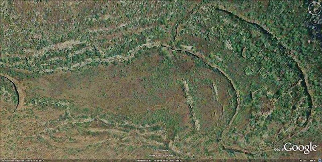 | FUE BASTANTE TIEMPO DESPUÉS DE HABER DESCUBIERTO LA FIGURA DEL PRIMER PEZ, CUANDO DESCUBRIMOS QUE JUSTO ENFRENTE, AL OTRO LADO DE LA EXPLANADA, Y TAMBIÉN EN LA BASE DE LA LADERA CONTRARIA, SE PODÍA VER, AUNQUE CON MÁS DIFICULTAD POR ENCONTRARSE LOS MUROS CON QUE FUE CONFECCIONADO, MÁS ESTRAGADOS, LA FIGURA DE OTRO PEZ ALGO MÁS PEQUEÑA QUE EL ANTERIOR, DIRÍAMOS, SU PAREJA, BARRIGA DE UN PEZ FRENTE A LA DEL OTRO, Y DE NUEVO SE PODÍA APRECIAR COMO HABÍAN UTILIZADO UN MURO DE ALGO DE GROSOR, PERO MUY BAJO, COMO ESPECIE DE CABLE O CORDÓN, QUE UNÍAN PERFECTAMENTE A LOS DOS PECES POR SUS COLAS |